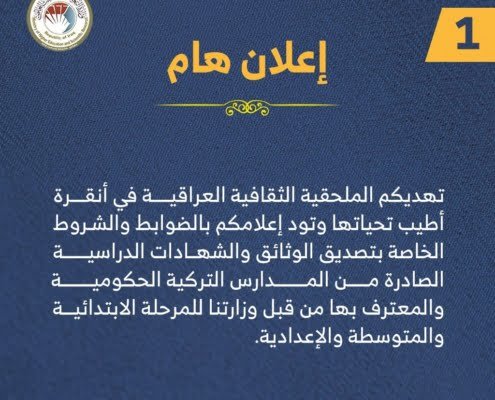 تهديكم الملحقية الثقافية العراقية في أنقرة أطيب تحياتها وتود إعلامكم بالضوابط والشروط الخاصة بتصديق الوثائق والشهادات الدراسية الصادرة من المدارس التركية الحكومية والمعترف بها من قبل وزارتنا للمرحلة الابتدائية والمتوسطة والإعدادية.