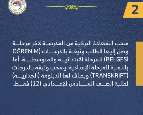 1- سحب الشهادة التركية من المدرسة لآخر مرحلة وصل إليها الطالب وثيقة بالدرجات (ÖĞRENIM BELGESI) للمرحلة الابتدائية والمتوسطة. أما بالنسبة للمرحلة الإعدادية، يسحب وثيقة بالدرجات (TRANSKRIPT) ويضاف لها الدبلومة (الجدارية) لطلبة الصف السادس الإعدادي (12) فقط