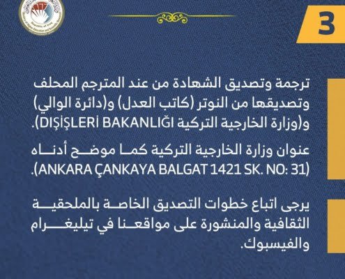 2- ترجمة وتصديق الشهادة من عند المترجم المحلف وتصديقها من النوتر (كاتب العدل) و الوالي و وزارة الخارجية التركية