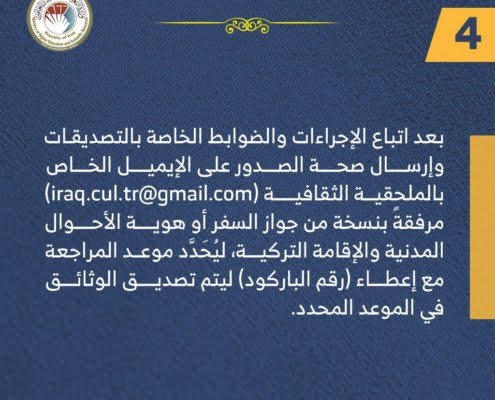 3- بعد اتباع الإجراءات والضوابط الخاصة بالتصديقات وإرسال صحة الصدور على الإيميل الخاص بالملحقية (iraq.cul.tr@gmail.com) مرفقة بنسخة من جواز السفر أو هوية الأحوال المدنية والإقامة التركية، ليُحدد موعد المراجعة مع إعطاء (رقم الباركود) ليتم تصديق الوثائق في الموعد المحدد. استمارة صحة الصدور اضغط هنا