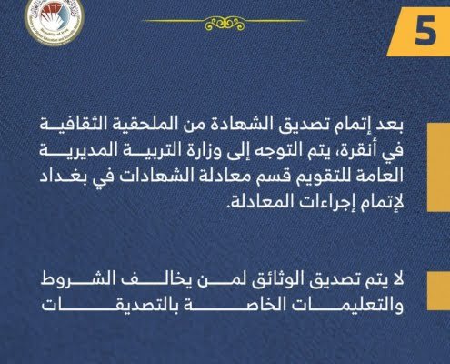 4- بعد إتمام تصديق الشهادة من الملحقية الثقافية في أنقرة، يتم التوجه إلى وزارة التربية المديرية العامة للتقويم قسم معادلة الشهادات في بغداد لإتمام إجراءات المعادلة